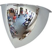 This 90° observation mirror is specially designed to provide clear visibility around corners, making it ideal for T-junctions, hallway intersections, or L-shaped warehouse aisles. Its quarter-dome shape delivers a wide, panoramic field of view across two converging directions.