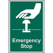 The bold "Emergency Stop" text on a high-contrast background makes this sign easy to read from a distance, ensuring quick identification in emergency situations.
