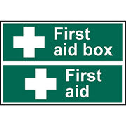 Ensure quick access to first aid supplies with the Self-Adhesive PVC "First Aid Box" / "First Aid" Sign 300mm x 100mm (Pack of 2). These high-visibility, durable signs are designed to clearly mark the location of first aid kits or boxes, ensuring that they are easy to locate in case of an emergency.