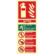 Features bold “WATER EXTINGUISHER” text and universal fire extinguisher symbols. The photoluminescent coating absorbs light and glows in darkness for high visibility.