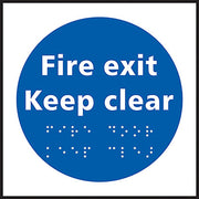 Bold, High-Contrast Design: The "Fire Exit Keep Clear" message is printed in clear, legible text for both sighted individuals and those relying on Braille.